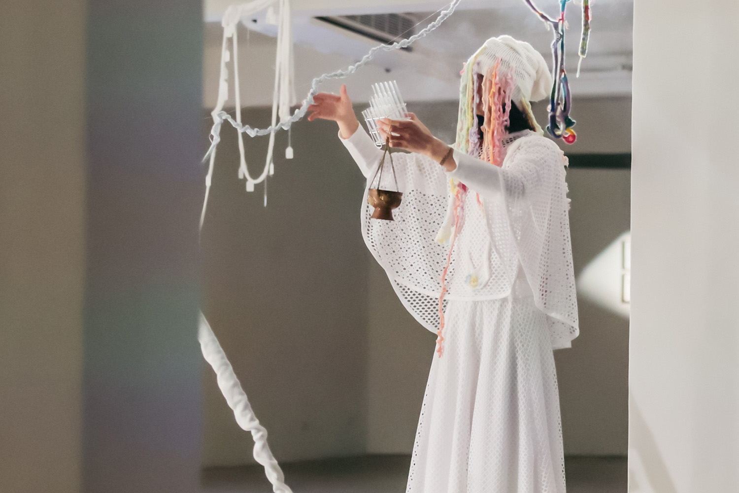 The works of Pei-Ying Lin, recipient of the 3rd Tung Chung Prize, incorporate a blend of biology, society, culture, and art. At such a critical juncture for the future of humankind, she has ventured to highlight the numerous overlapping adversarial or adaptive relationships that exist in the long-term coexistence of humans and viruses as a reflection upon the meaning of life in the universe. Inter-(Being) utilizes viruses as a medium, viewed through mental, physical, and behavioral lenses. In Studies of Interbeing – Trance 1:1, a shaman tries to summon the spirit of COVID-19 in a ritual that incorporates religious music and rhythmic movements—they mimic the viral replication process through hand knitting and write about the spirituality of the virus. Studies of Interbeing – Pedigree X is a collaboration using BIONET Corporation’s genetic sequencing technology to explore the possibility that humans may be descendants of microbial families. Discourse of a Viral Boundary is an imaginary narrative construct of the viral outbreak, formed out of people’s hidden desires and fears about the virus during the pandemic; and the ten basic principles for interspecific symbiosis laid out in Manifesto for the Holobiont in Its Infancy – Human Version outline a new model of coexistence with microbes. Lin utilizes unconventional contexts to fully examine the virus, and in doing so generates a new understanding of human-viral coexistence.