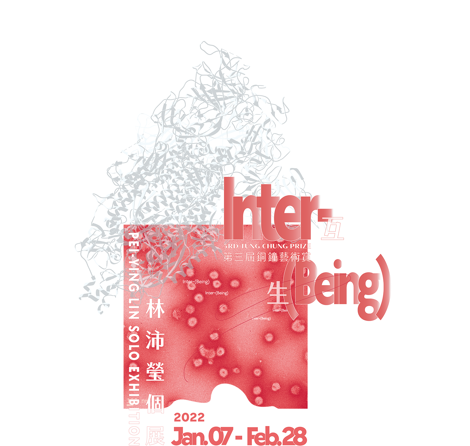 第三屆銅鐘藝術賞藝術家林沛瑩,揉合了生物科學、社會文化及藝術的疆界,在面對當前人類存亡的歷史關口,企圖提出病毒與人類共存為恆常之下,人類與病毒的多種對立或磨合的交疊關係,從多向度看待宇宙自然間的生命意義。《互生Inter-(Being) —林沛瑩個展》以病毒作為思考媒介,分別從精神、身體、行為等面向切入,不論是《相即共⽣練習簿-出神1:1》薩滿靈媒召喚冠狀病毒靈的降靈儀式,藉由多宗教樂曲及肢體律動,透過手工針織模擬電子顯微鏡下的病毒蛋白質複製機制,書寫病毒靈性的文化儀式;或是《相即共⽣練習簿-族譜X》結合訊聯生物科技(Bionet)的基因定序檢測,透視微生物家族是人類祖先的可能性;《邊界溶解》建構病毒爆發的想像敘事體,收集疫情下人對病毒所隱藏的慾望恐懼;《合⽣體初⽣宣⾔(⼈類版)》的十個跨物種合作基本⾏為準則,初生學習與微生物共處的新模式。藝術家向病毒展開詰問,非典型的語境表述人類與病毒共存的新認知。